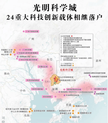入驻创新载体:24项重大科技创新载体相继落户光明,包括九大科学装置、两所省重点实验室、十一个科研平台;