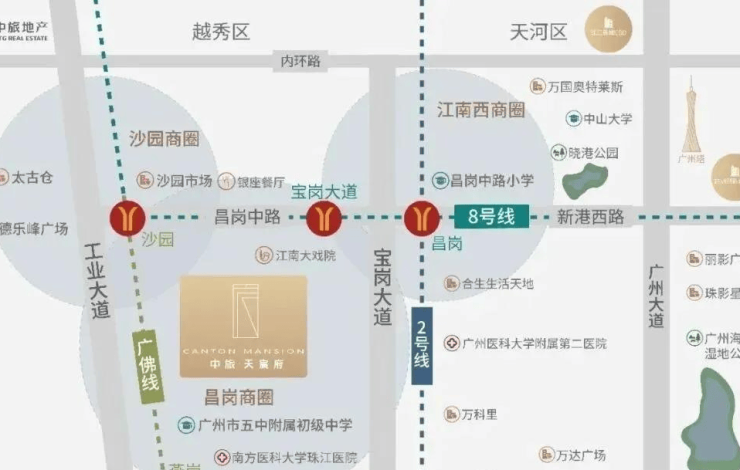 买房③要素,地段、地段、还是地段,项目位于海珠昌岗中路与宝岗大道交汇处,宝岗大道、工业大道、江南大道,海珠三大黄金走廊环绕。