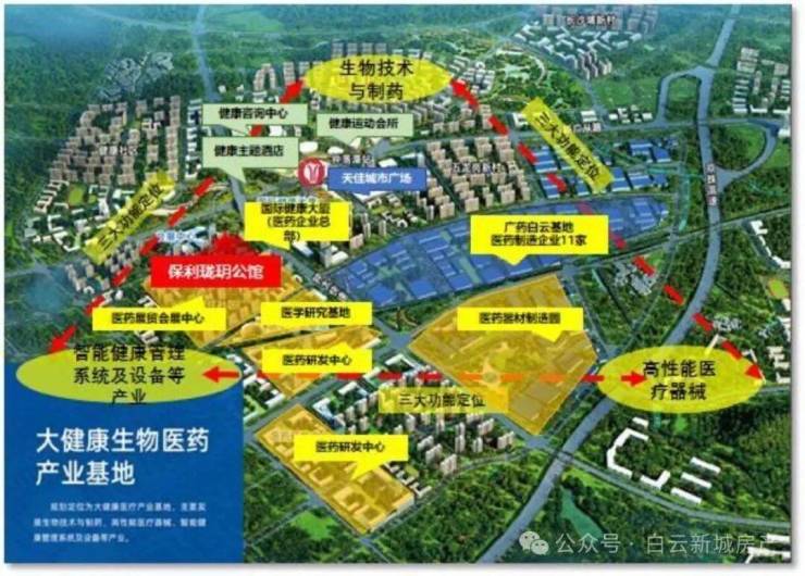 广州大健康产业基地:投资200亿,规模约等于22个广钢新城,已有何济公、明兴制、广药集团、和黄中药等29家知名健康产业企业入驻,健康城整体包含医药研制、职业教育、健康服务和健康养生四大功能片区。