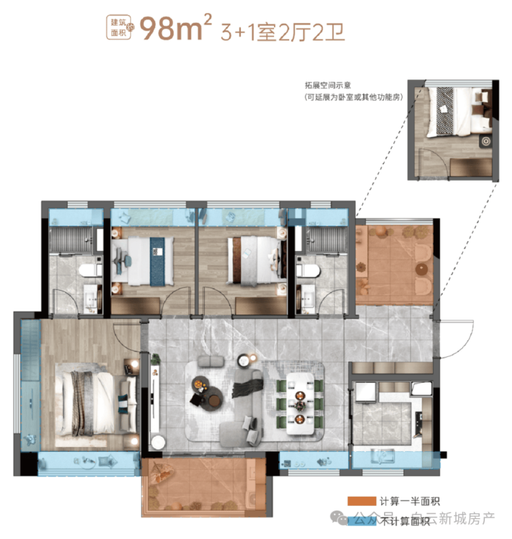 3. 98㎡,四房二卫户型