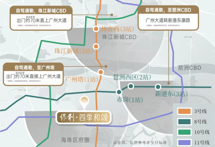 交通:3/8/10/11号线4地铁交汇,1站广州塔,2站珠江新城,3站琶洲西区;出门即广州大道,畅达珠江新城,体育西,琶洲。
