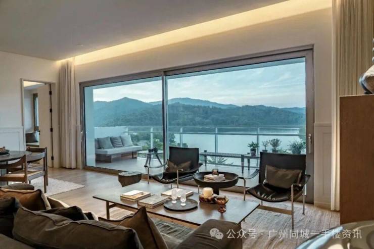 上庭下院设计,很有叠墅的感觉,还能望4A级的九龙湖头排湖景。240㎡户型板房,刚进二层客厅,壮丽的湖山画卷就在眼前铺开,在广州能把景区作为家中背景板的项目,确实没几个。