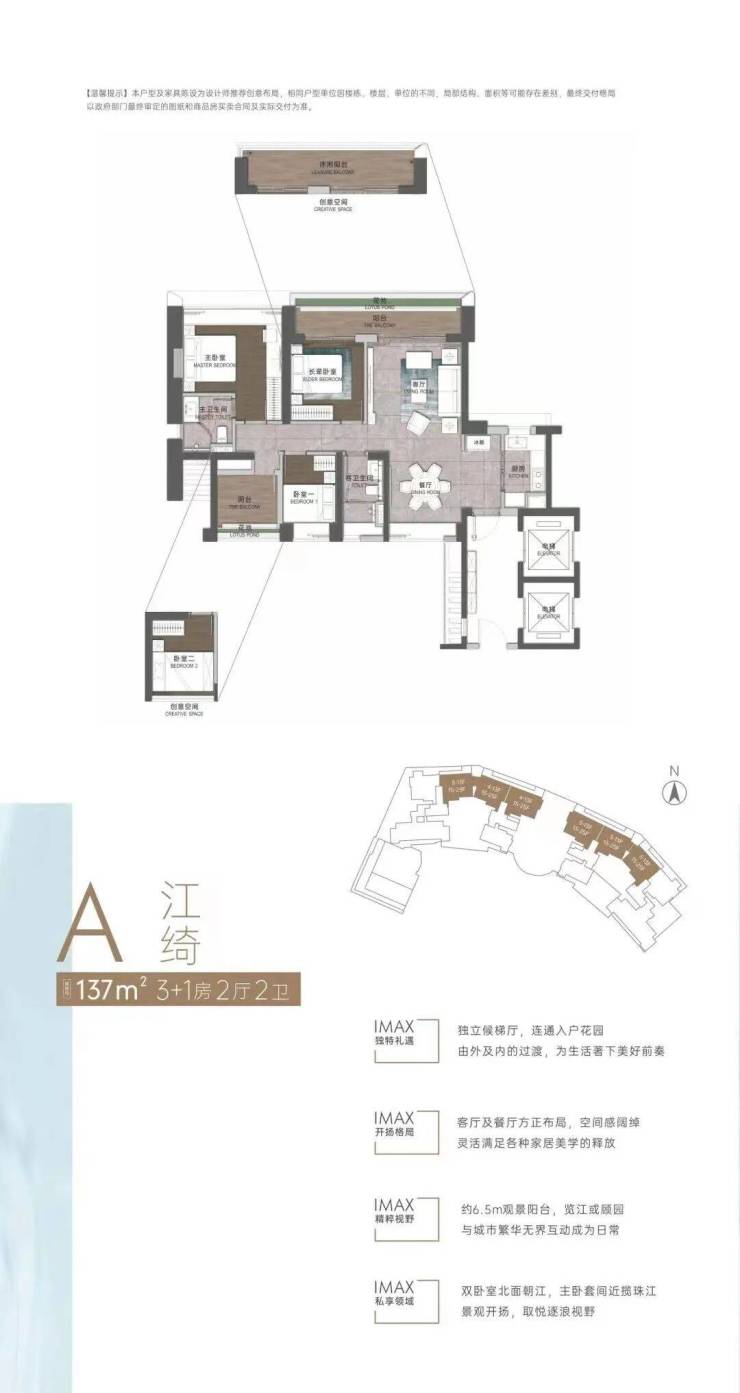 137㎡3+1房,独立侯梯厅,可外置玄关柜。6.5米长观景阳台与餐厅南面窗户南北对流,高层主卧和旁边的次卧都可以望江。