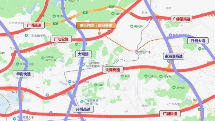 交通路网 5纵:华南快速、广州绕城高速、京港澳高速、大观路、开创大道