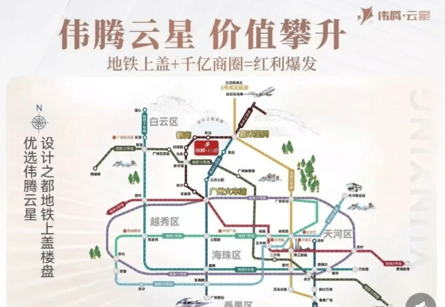 伟腾·云星地处白云区黄边板块、广州设计之都核心启动区,是白云新城向北拓展的关键节点。项目位于白云新城南北发展主轴之上,西倚白云山生态屏障,东接嘉禾望岗枢纽,南连白云智慧城,形成“生态+产业+轨道”三位一体的黄金区位。最突出的优势在于其地铁上盖属性——直接建于14号线鹤南站(在建)之上,该线路未来将串联嘉禾望岗、广州火车站、广州东站等核心枢纽,并可通过换乘快速通达珠江新城、琶洲等地。自驾方面,项目距华南快速入口仅约600米,黄边北路、鹤龙一路、机场路等主干道环绕,出行效率较高。这一“轨道+产业新城”的双重定位,赋予项目显著的成长预期。