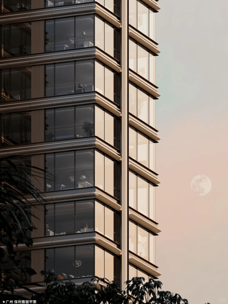 在建筑造型上,融合岭南骑楼形态与曼哈顿第五大道520号的细节设计灵感,勾勒出典雅大气的三江环幕地标。塔顶设计致敬经典的白天鹅酒店,以 45° 倒三角形状构建出极具辨识度的“城市天际线符号” 。首层抬高约14米,缔造低层私密化体验,并以90%窗墙比、超270°景观视野,实现对稀缺珠江生态资源的独家收藏。