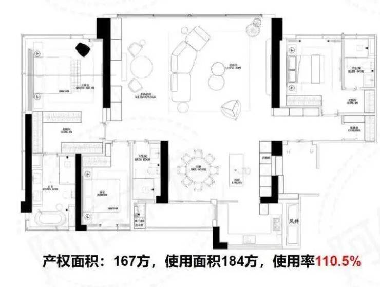 建面约165㎡的户型:拥有近19米观江面,“4+2房3卫双主套”