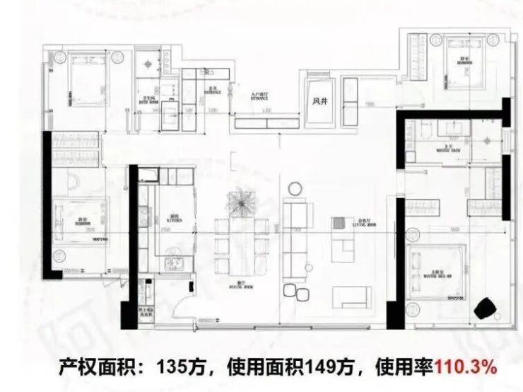 建面约135㎡大平层户型:“四叶草+约7.4米横厅”格局