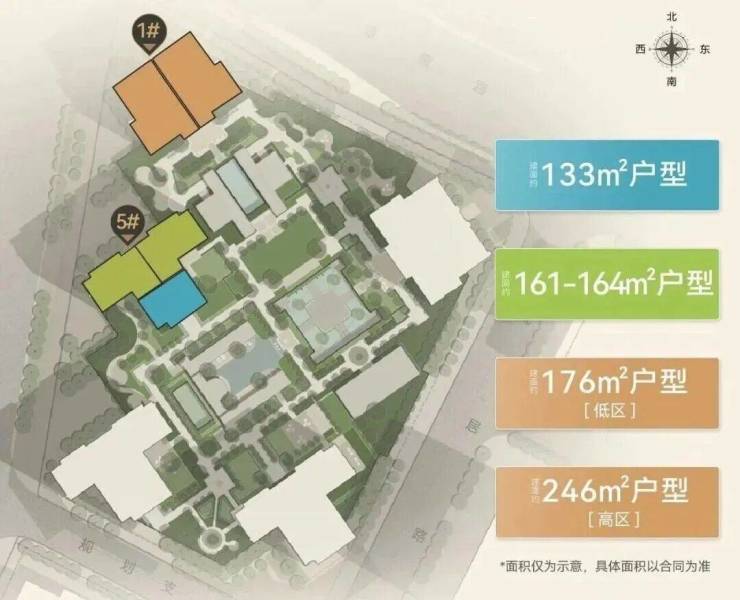 项目设计了5栋56-58层超高层的塔楼以及板楼产品。建面约133-164-176-246㎡四大户型。