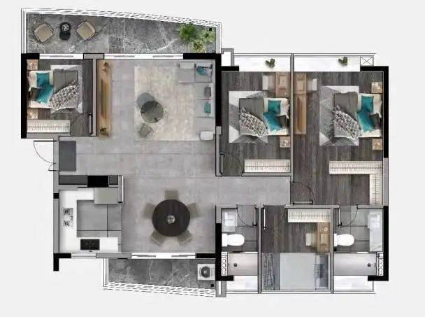 131㎡户型利用率很高。该户型面向小区,为南向双阳台,大阳台连接客厅与主卧,采光和景观视野俱佳,直接俯瞰2300平的泳池和儿童休闲空间等景观。
