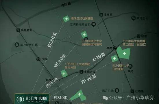 项目2公里范围之内,有7所大型的医疗机构,最近的则是在项目西北角直线800米的珠江医院。