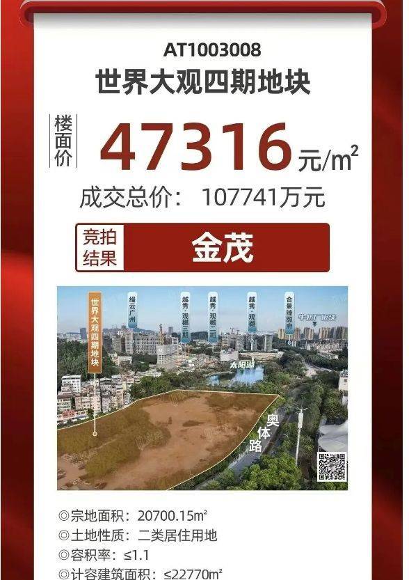 金茂越秀·璞樾墅位于广州市天河区大观路以东、奥体路以北(AT1003008地块),即原世界大观四期地块。项目由北京方兴亦城置业有限公司(金茂全资子公司)于2025年3月竞得,成交总价约10.77亿元,折合楼面价高达50390元/㎡,足见其地段价值与开发预期之高。