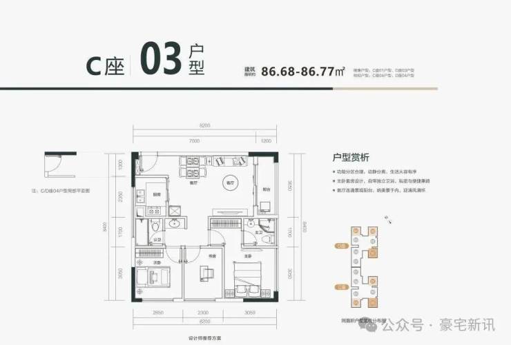 🏡C03户型:约86㎡全能大三房,南北通透 + 全明格局