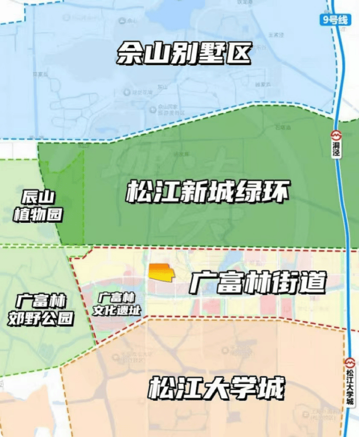 左邻广富林遗址公园、广富林郊野公园及辰山植物园。南面广富林路一路之隔就是松江大学城。7所高校在此聚集,底蕴浓厚,为广富林注入现代人文底色。
