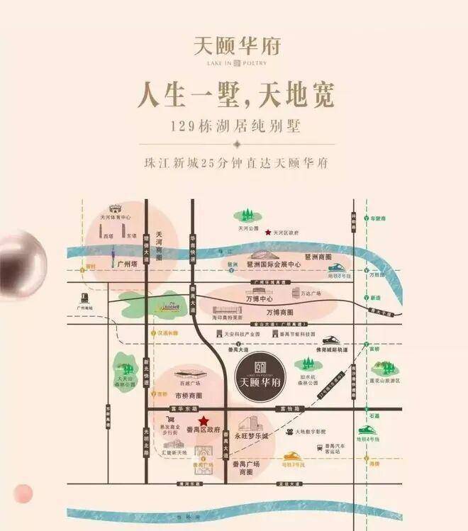 作为番禺广场板块唯一纯别墅 ,天颐华府于天赋地脉之上,集萃一城精华。北接广州第四CBD万博板块,南承对外开放门户枢纽南沙自贸区,东靠番禺创新经济与产业开发板块,西连南站板块。