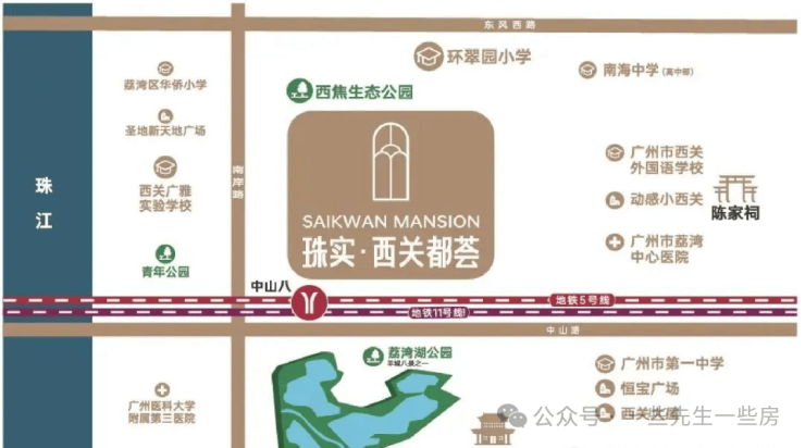 地铁“500米生活圈”:直线距离5/11号线中山八站约500米(步行6-8分钟),5号线直达珠江新城(25分钟)、金融城(15分钟);11号线(2024年底通车)作为广州首条地铁环线,串联火车站、琶洲、白鹅潭,1站到中山七路,3站到广州东站,通勤覆盖“老城区+新中心”。