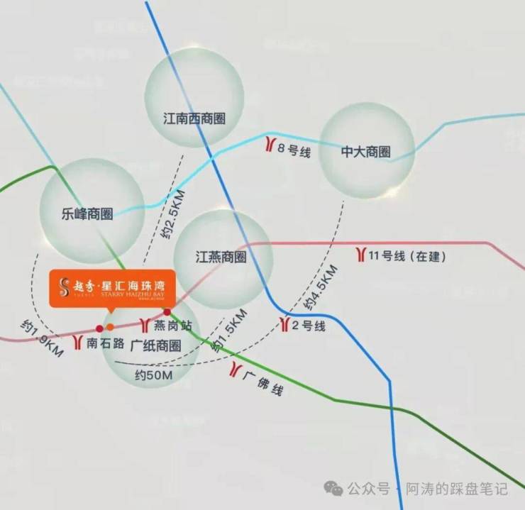 广州11号线(在建)贯穿项目,广州首条环城地铁,0换乘直达琵洲、广州火车站、广州东站;距广佛线燕岗站约450米,接入3号线,7站到达珠江新城;海珠环岛路(在建)工程进度不断刷新,价值即将兑现。