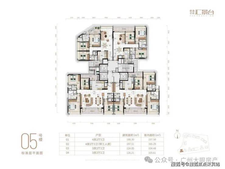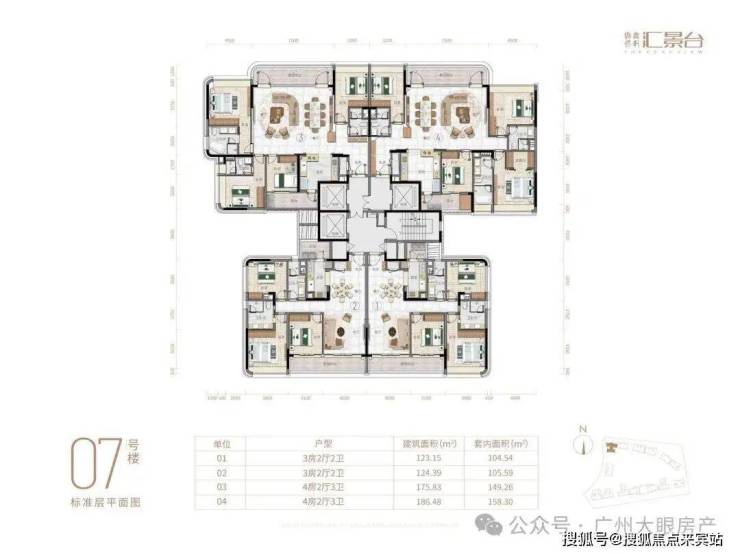 项目由14栋12层小高层组成,产品涵盖123-352㎡三至五房,共8类户型,户型实用率约82-84%