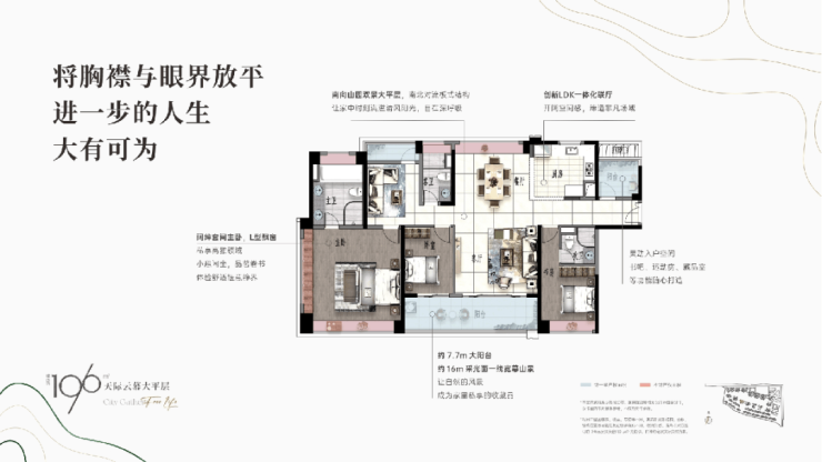 196㎡3+2房3卫,改善大平层,四开间朝南,采光充足。南北通透,空气对流,景观大阳台连通次卧,双套房设计,三代同堂更从容。