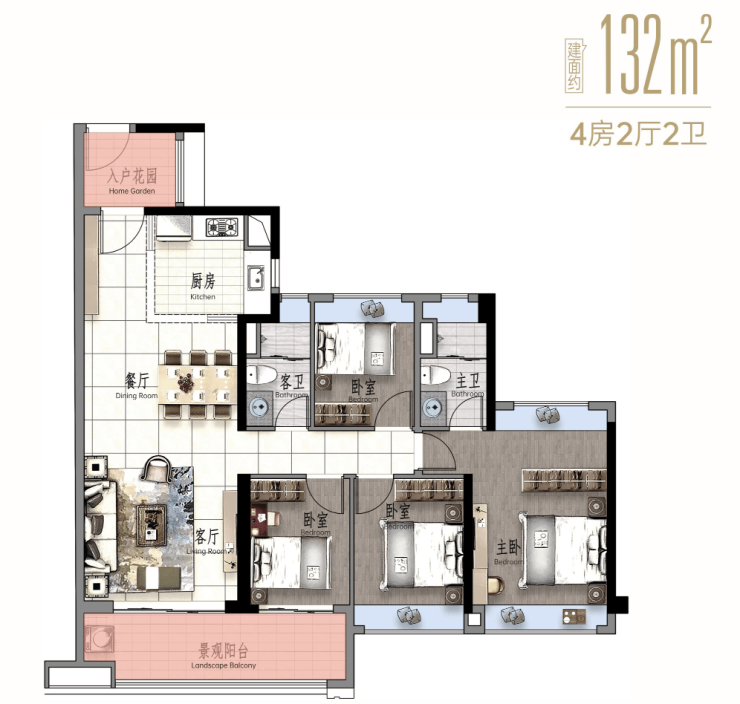 140㎡4房2卫,LDK一体化联厅,南北通透,客厅近6米超大进深,阔绰主卧套房,270°景观飘窗。