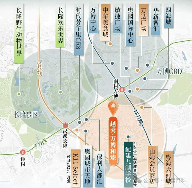 位于广州市番禺区鹤地塘边街3号,广州地铁7号线与地铁18号线交汇的南村万博站、以及与地铁3号线交汇的汉溪长隆站附近;坐落于番禺核心地段万博商圈,广州五大商圈之一,承接了广州未来10年的发展,前景无限!
