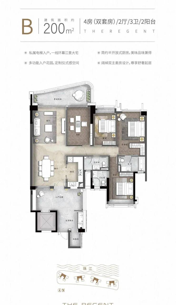 『天启』组团面积约140-250㎡环幕临江大平层,坐拥江景第一排,眺望小蛮腰,享500米宽阔无遮挡江景视野,并邀请三大全球知名设计大师倾力打造,并配备12大国际一线品牌交标,专梯专户四房双套房设计,世界灵感前沿作品礼献广州!