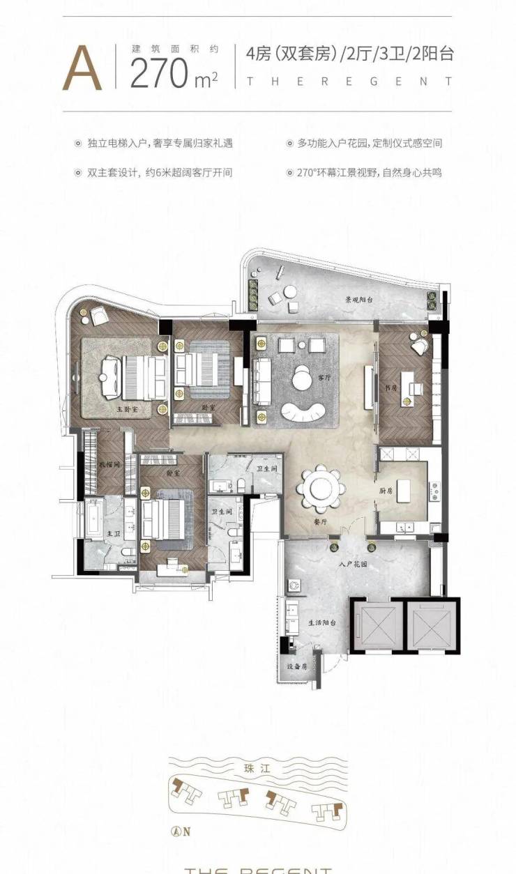 坐拥江景第一排,眺望小蛮腰,享500米宽阔无遮挡江景视野,并邀请三大全球知名设计大师倾力打造,并配备12大国际一线品牌交标,专梯专户四房双套房设