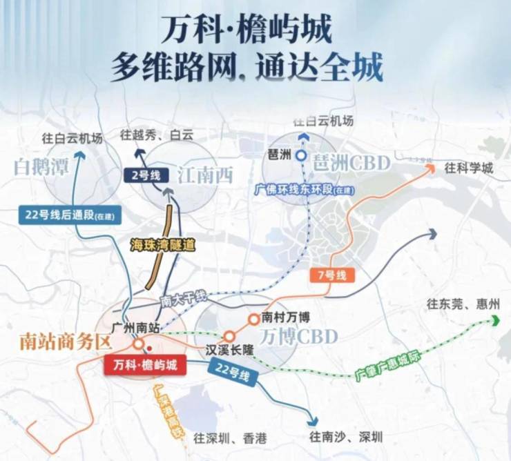 未来东晓南路-广州南站连接线、海珠湾隧道通车后,与海珠、珠江新城的通勤时间将进一步缩短,1小时可达湾区核心城市。