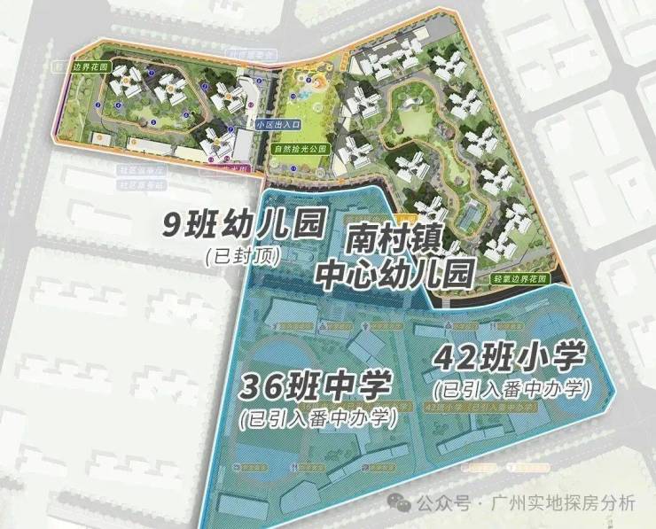 配建了一所42班小学和36班初中,总提供3600个学位,该项目已成功引进公办名校番禺中学进行办学,预计2025年9月就能开学。
