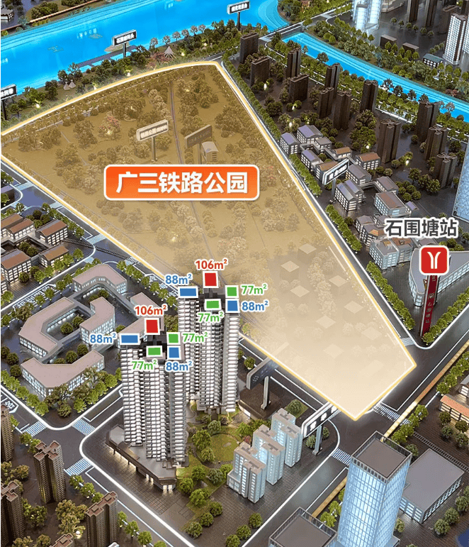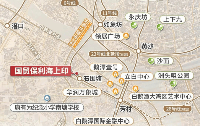 项目距离白鹅潭CBD核心区约1公里,出门往东约200米就是地铁11号线石围塘站,一站就到万象城、大湾区艺术中心等。近距离共享白鹅潭心脏区域的高端配套,近地铁,日常通勤也很便利。在建的如意坊隧道也在附近,开车到老西关只要几分钟,过江去往越秀、天河也会比现在快很多。