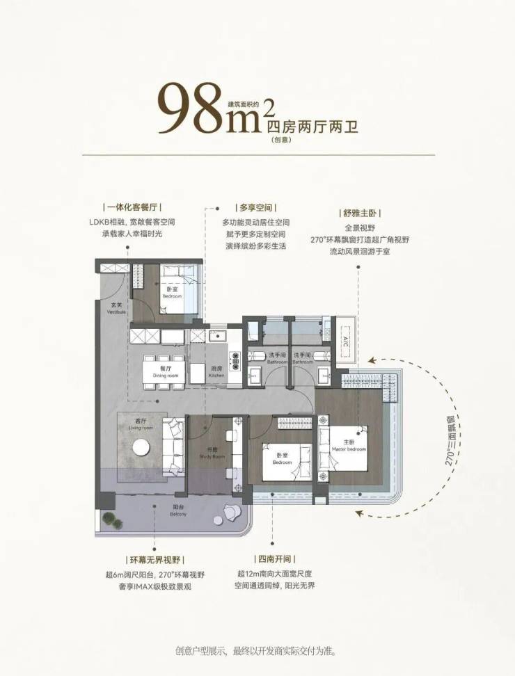 LDKB一体化设计,超6米宽阔阳台,四开间朝南,270°环幕视野。