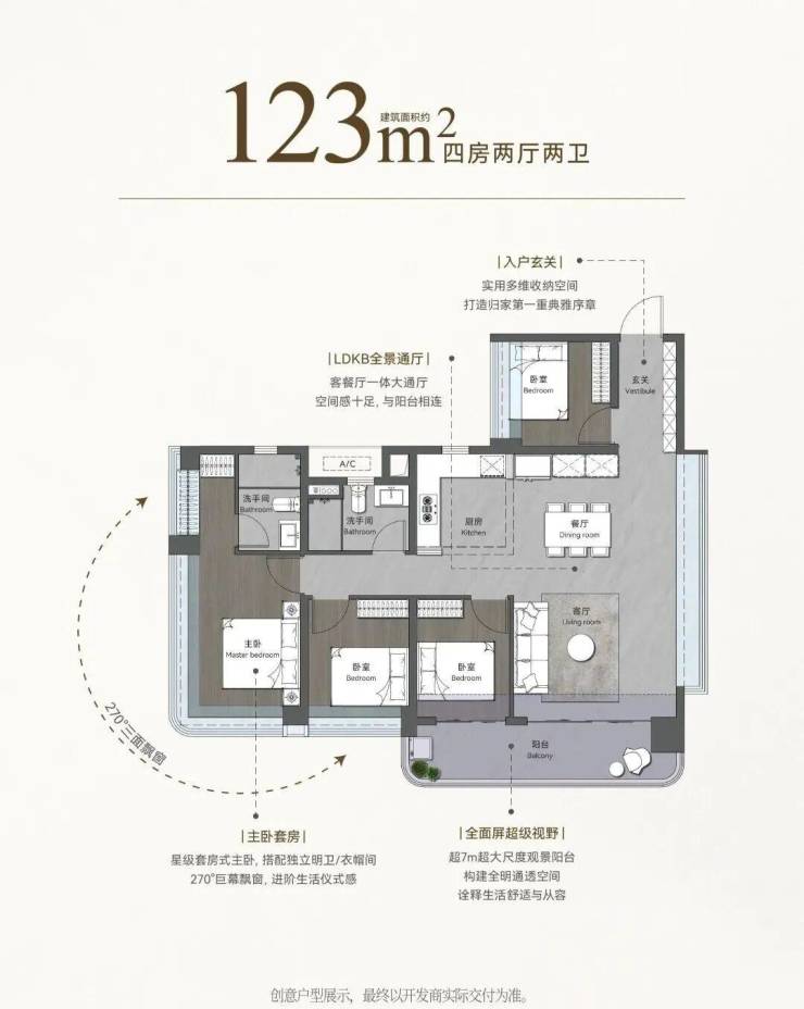 朝向:西南向16m超大尺度观景阳台,6.6m270°观景阳台,约30㎡超大主卧,270°全景飘窗