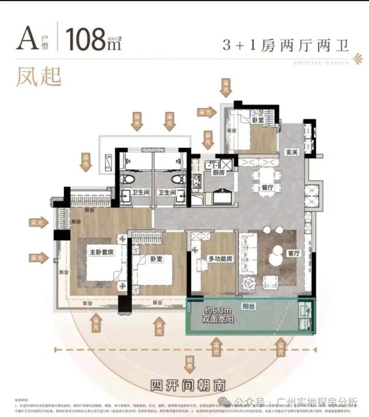 108㎡3+1房两厅两卫,南向四开间 ,约6.3米双面宽阳台,约100%使用率。