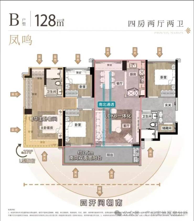 约128㎡四房两厅两卫,南向四开间,约7.5米双面宽阳台,约100%使用率。