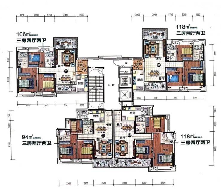 项目在售户型包括94方(三房两卫)、109方(三房两卫)、118方(三房两卫),户型图如下: