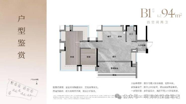 约74-94㎡三至四房,2梯4户设计,四面宽朝南,大方厅设计,小家也有大精彩。