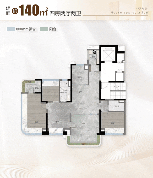 约140㎡四房,双主套+双阳台+U型厨房。