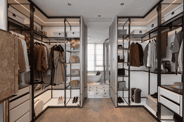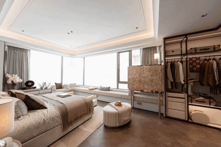 约190㎡四房,南向景观阳台横跨客餐厅,尺度很大;主卧套房,衣帽间够大,卫生间也能放得下浴缸;另一个套房,能做小一点的衣帽间。