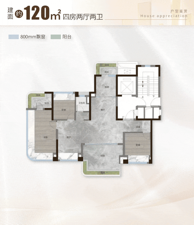 约120㎡四房,主卧270°飘窗,带衣帽间;南北双阳台,一面观景,一面晾晒。