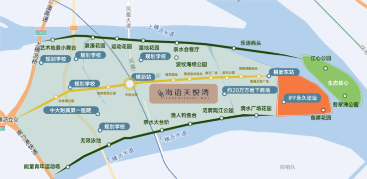 项目配建约1000m²公园式商业街。近享国际金融岛约20万㎡地下商业广场(规划中)。通过凤凰大道可达万达广场、悠方广场、凤凰广场(在建中)、星河Coco-Park(在建中),以及灵山岛约4万㎡地下商场(在建中),繁华商圈呼之欲出,大城精彩即将上演。数据来源:《明珠湾起步区(横沥岛)控制性详细规划》
