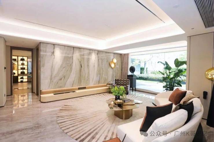 一进大门,整个入户大堂以宝格丽酒店设计风格为灵感,每一个细节都透出映射质感。约7米高的艺术移门辅以奢石弧形墙面,以强烈的仪式感,勾勒通往越秀·万博和臻的“玄关”。