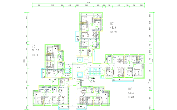 建面约87㎡四房2卫,,使用率为113%-120.5%。竖厅的为带独立玄关的竖厅布局,动线清晰;单边位设计,实现南北对流,并拥有U型采光面,主卧观景与采光效果更佳。在不足90㎡的空间内实现四房功能,极大提升了空间利用率。