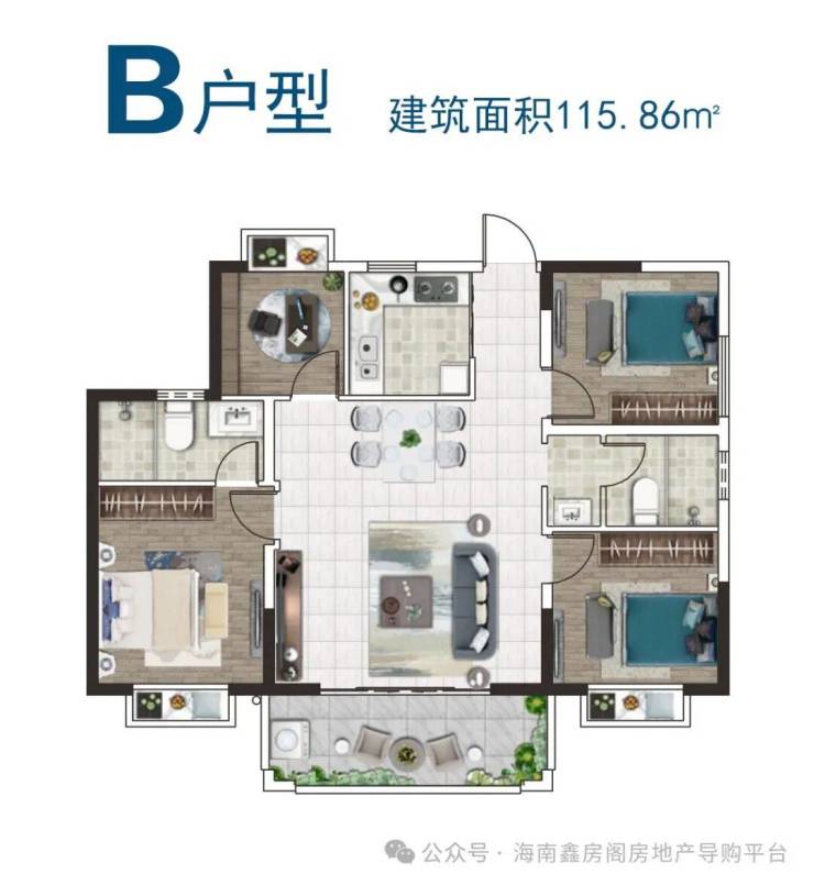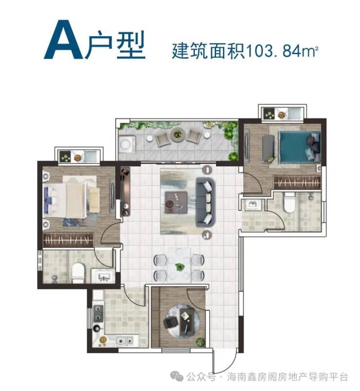 户型分为A型103.84㎡、B型115.86㎡、C型112.38㎡,A+复式型199.19㎡、B+复式型215.72㎡、C+复式型231.04㎡六种。
