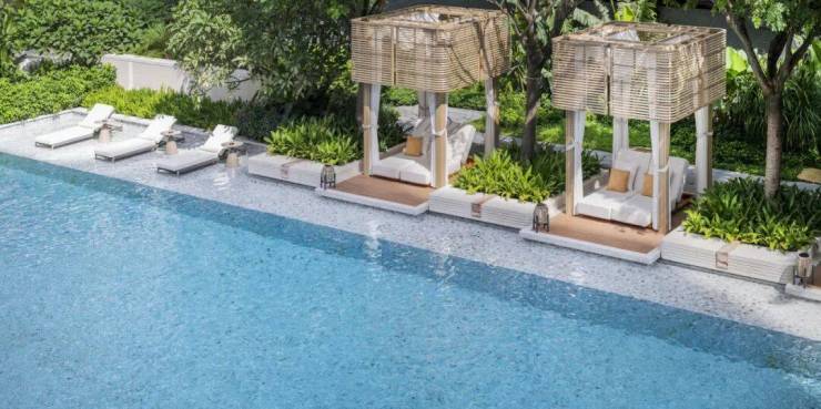 林下泳池CLUB涵盖亲子按摩池与家庭泳池,兼具社交、休憩与观景功能;池畔亭廊与休闲座区隐于热带林木之间,流水与绿植共奏度假舒缓旋律。