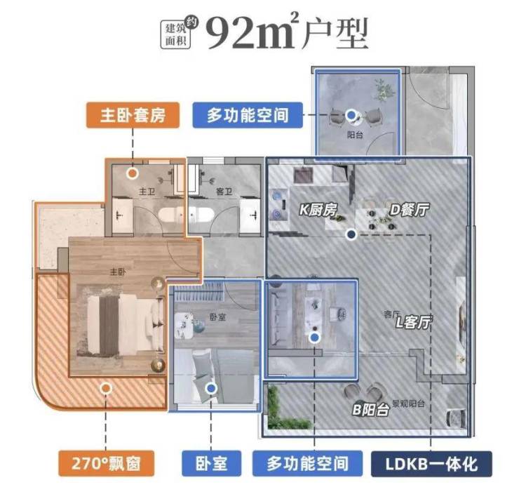 96㎡户型货量最多,相当于 80㎡的升级版,入户多了一个卧室,阳台长达 5.7 米,景观视野更开阔。