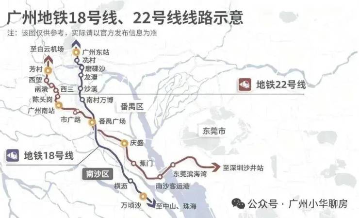 其中,22号线,时速高达160公里,能通达广州南站、白鹅潭商圈、白云机场、番禺广场等核心区域,且能一站换乘18号线。
