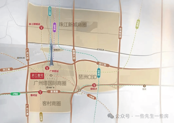 双轴交汇:地处珠江新城-广州塔、广州塔-琶洲两大轴线交汇处,与广州塔仅700米,高层可直望珠江新城天际线。珠江新城有111家总部企业(占全市30%),琶洲聚集超144栋甲级写字楼(贡献全市12%经济总量),两者叠加的产业势能,让项目自带“总部经济圈”的隐形价值。