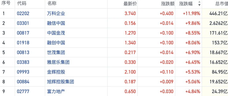 财联社12月10日讯(编辑 冯轶)港股内房股午后拉升走高。截至发稿,万科企业(02202.HK)涨近12%,中国金茂(00817.HK)、世茂集团(00813.HK)等多家房企也大幅跟涨6%以上。