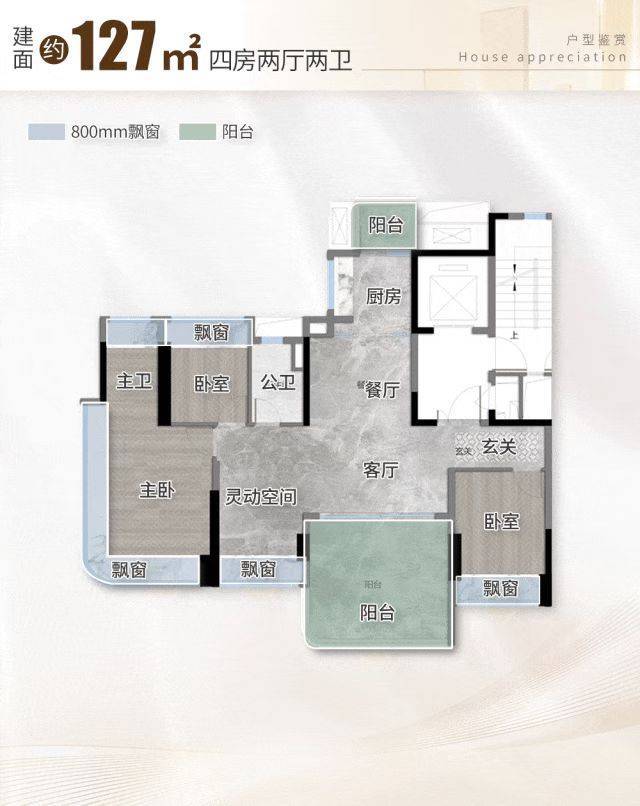建面约 127㎡户型做到四面宽朝南,南向采光面约 13.8 米,无论是客厅还是卧室,都能充分享受阳光照射。户型采用 LDKB 阔厅设计,主套与客厅均实现南北对流,穿堂风舒适宜人。空间设计灵活,极少承重墙的灵动布局让户型具备 “成长性”,可根据需求改造为四房 + 大客厅,或打通客厅与次卧形成约 7.3 米的超级方厅,在 120 多㎡空间内实现豪宅级奢侈尺度。主套采用 270° 弧形转角玻璃设计,配置独立卫浴与豪华衣帽间,三个次卧开间最小约 2.8 米,实现空间平权。