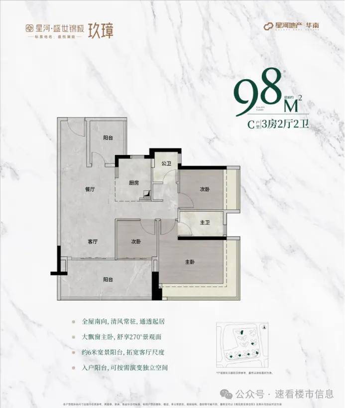 98㎡户型全新升级,主朝向朝南,让阳光洒满每一个角落。主卧配备 270° 无柱飘窗,视野开阔,美景尽收。次卧和阳台尺度大幅增加,提供更加舒适的居住体验,无论是休闲娱乐还是晾晒衣物都更加从容。